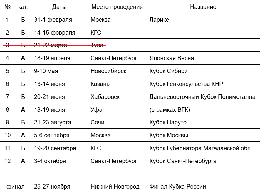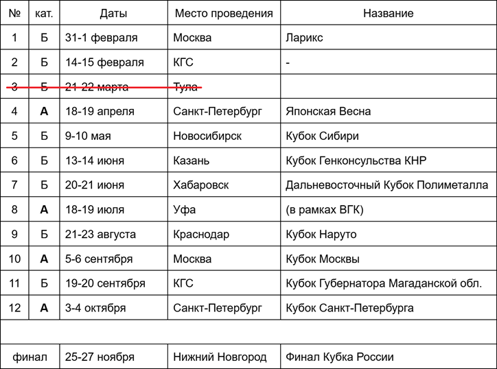 Тула, Сочи, Новосибирск, Хабаровск, Уфа, а также два онлайн-этапа) и проводящегося отдельно Финала КР.итоги КР подводятся в 2 этапа:
